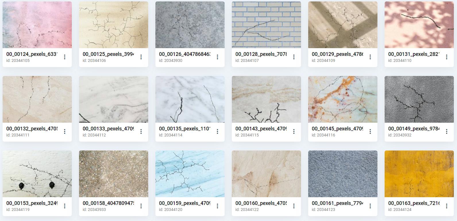 Our initial data collection strategy was automated web scraping from Flickr and Pexels. We targeted approximately 2 000 raw textures with keyword searches such as "asphalt", "asphalt texture", "wall texture", "concrete texture", "stone texture", and similar terms.