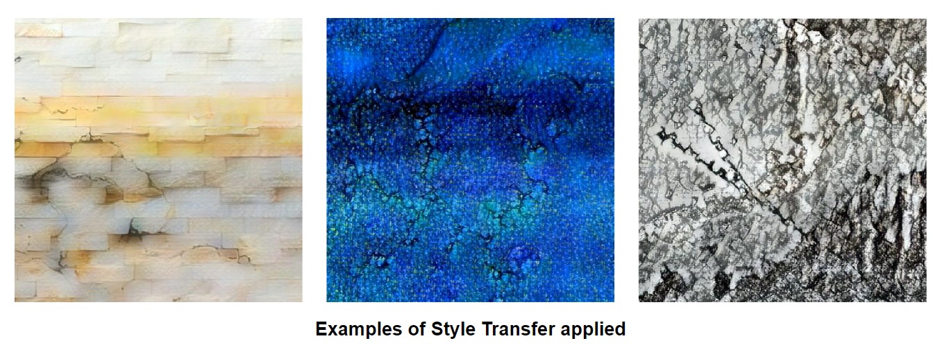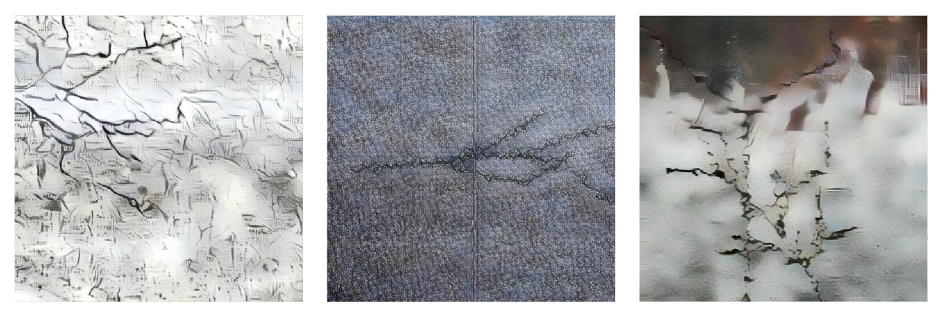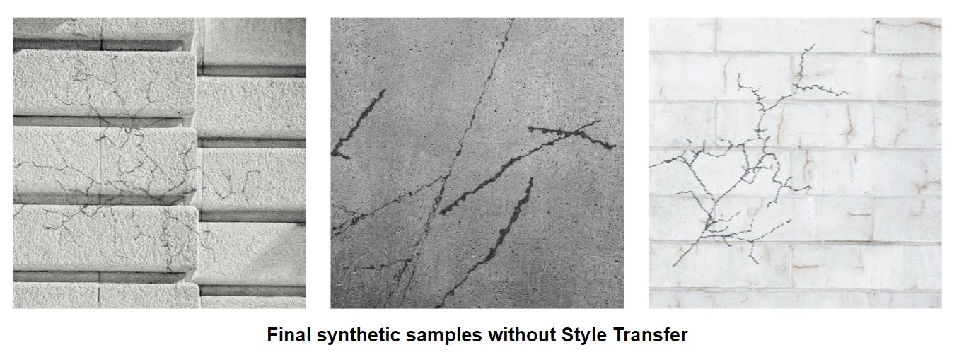 The Cracks Synthetic Dataset is sufficient to train a reliable model that achieves a quality comparable to a model trained on real data. The creation of the dataset involved three primary stages: collecting textures of real materials, procedural crack generation, and post-processing. Post-processing, crucial for achieving realism, focused on integrating cracks naturally into textures. To enhance our dataset's diversity, we incorporated a Style Transfer model.