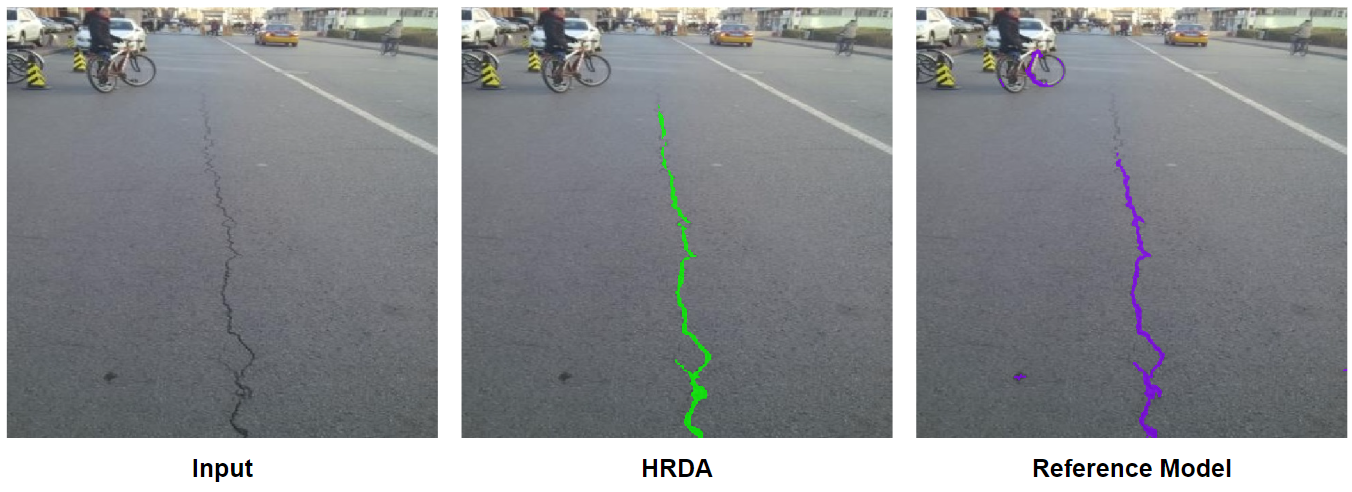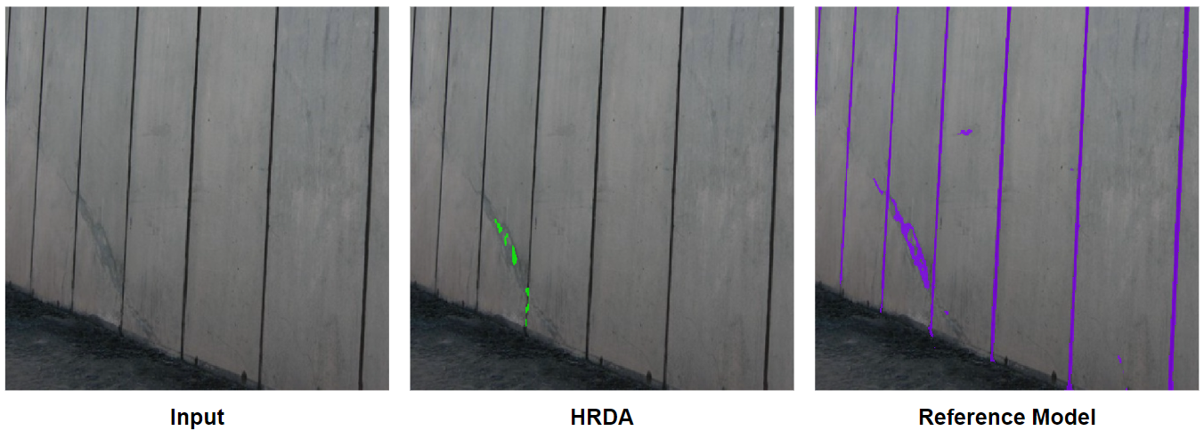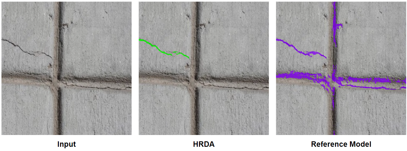 To our surprise, HRDA πŸ”₯ outperformed our Reference model, which trained using real data from 628 annotated crack photos.